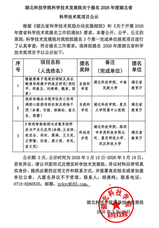 上一条:湖北科技学院科学技术发展院关于提名2026年度湖北省科学技术奖项目公示